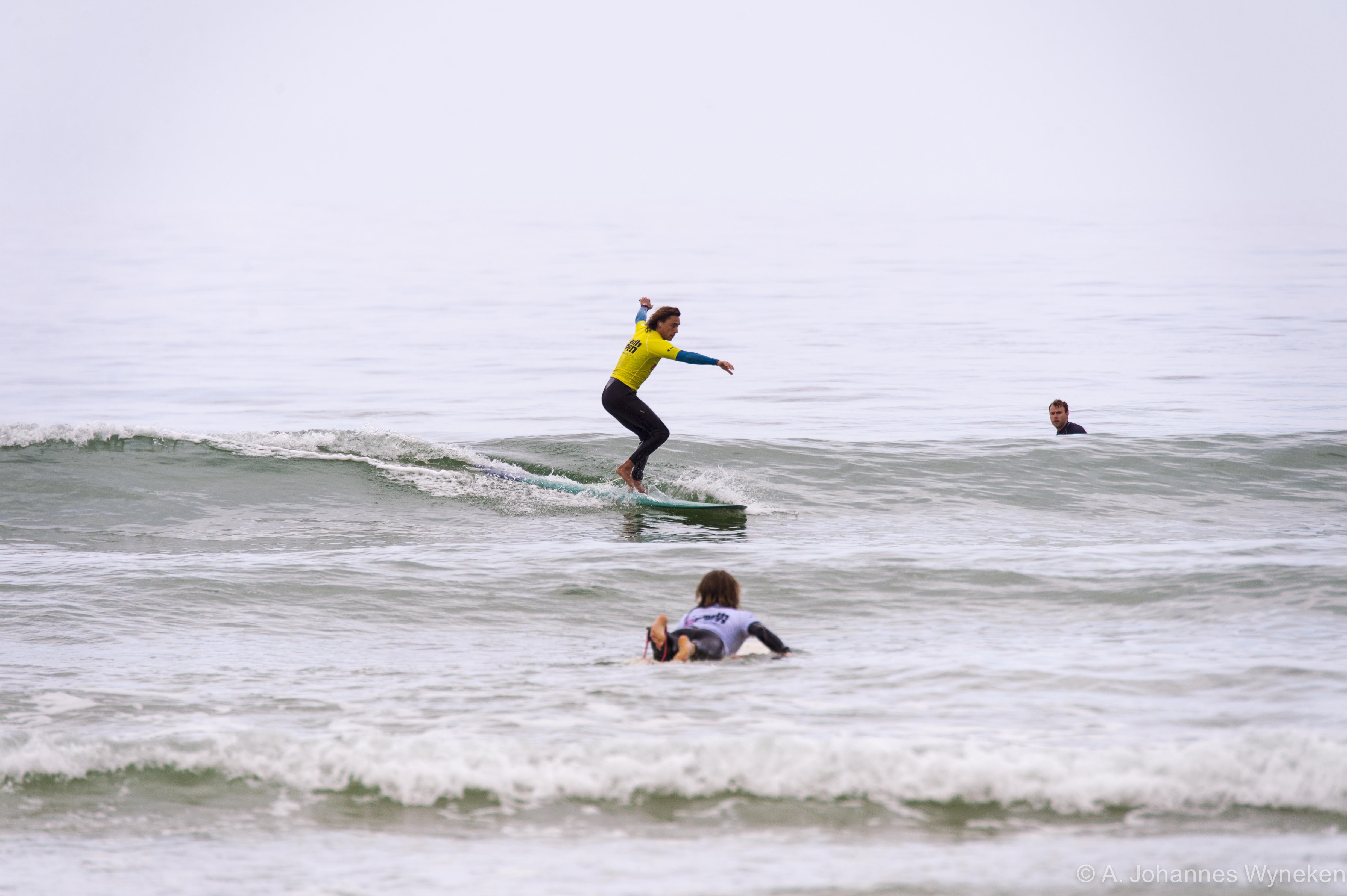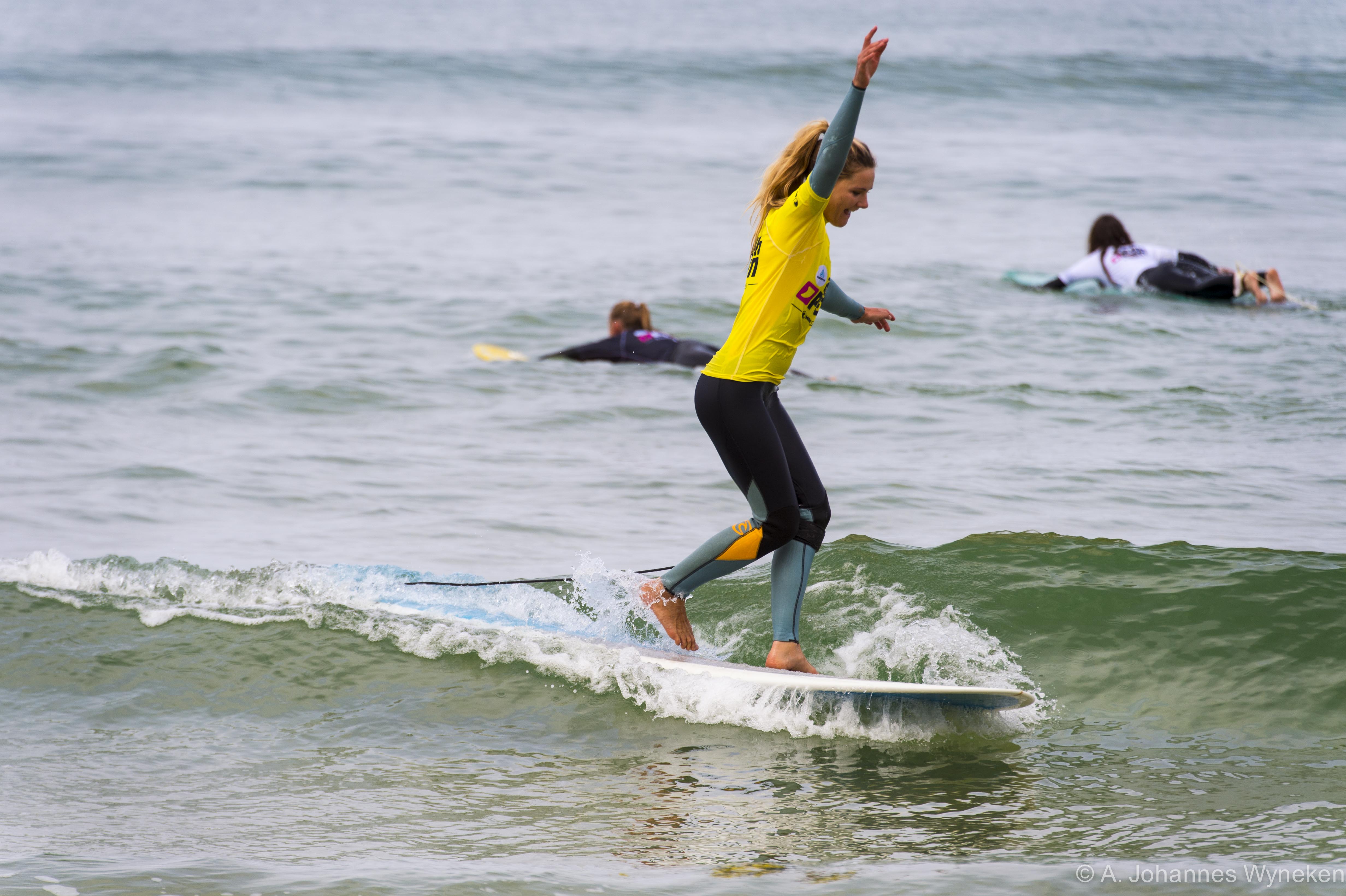 Nach dem Layday am Dienstag konnte die adh-Open Wellenreiten heute nun auch mit den Kategorien Open Women, Longboard Women und Longboard Men starten. Um den gestrigen Tag ohne Wettkampf aufzuholen wurde heute ab 9 Uhr früh bis um 18 Uhr simultan auf zwei Podien gesurft.