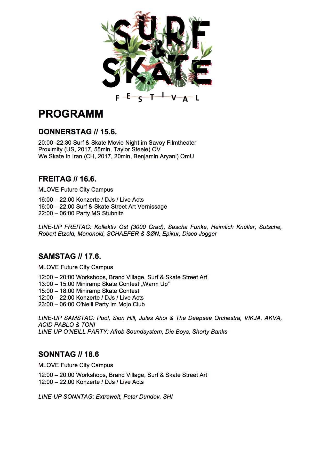 Zum zehnjährige Jubiläum des Surf & Skate Festivals in Hamburg wird richtig aufgefahren: mit einem dreitägigen Open-Air-Festival! Vollgepackt mit musikalischen Highlights aus der Elektroszene, bekannten Indiebands und einer feinen Auswahl an Singer & Songwritern. Für den Surf & Skate Flair sorgen Workshops, Skate-Contest, Filmvorführungen und die Kunstaustellung.