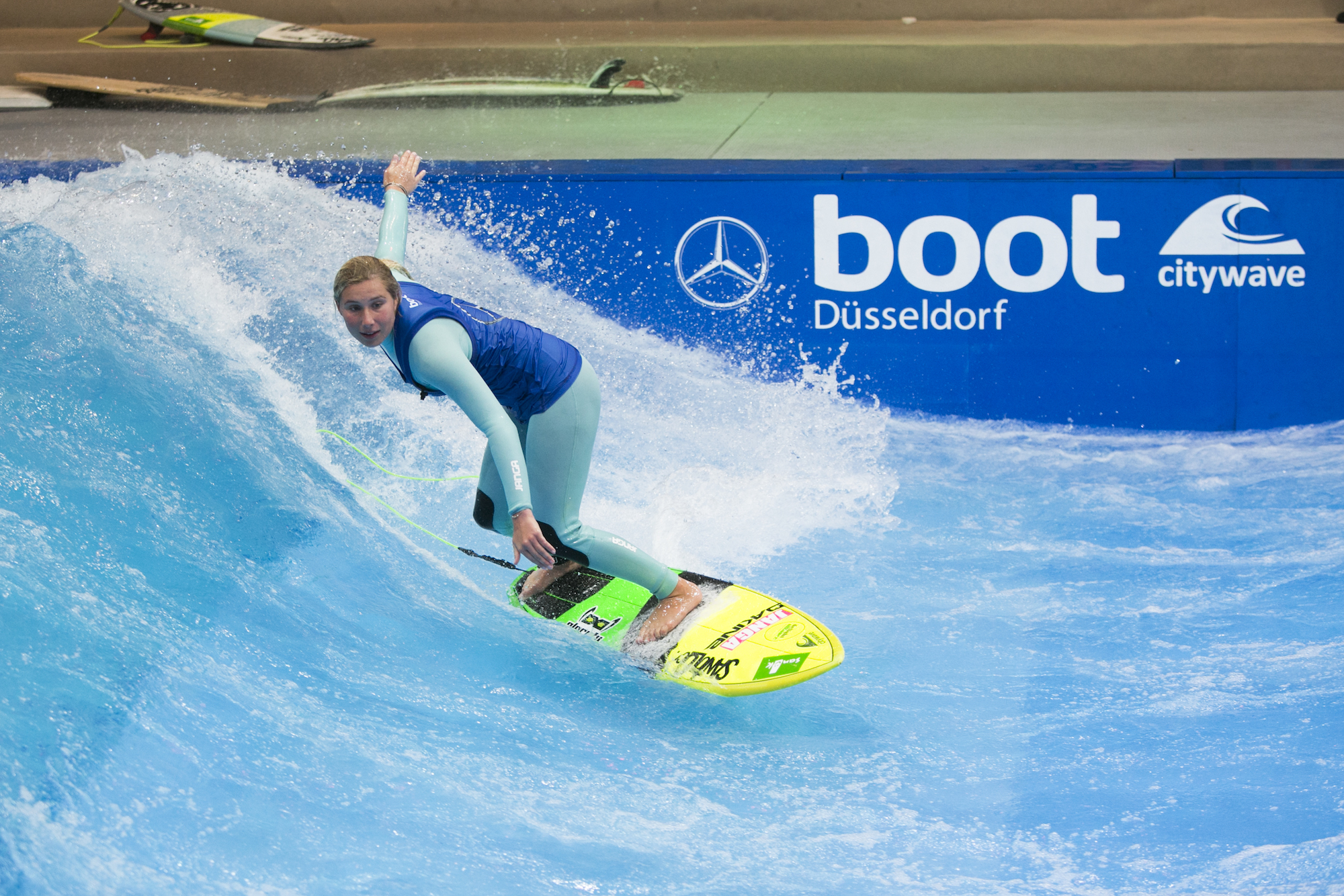 In Halle 8a des Düsseldorfer Messegländes trifft sich vom 19. bis 27. Januar 2019 die internationale Surfszene und der deutsche Nachwuchs zum Surfen auf der Deepwater-Wellenanlage THE WAVE made by citywave®. Diese wurde für dieses Jahr nochmals überarbeitet.