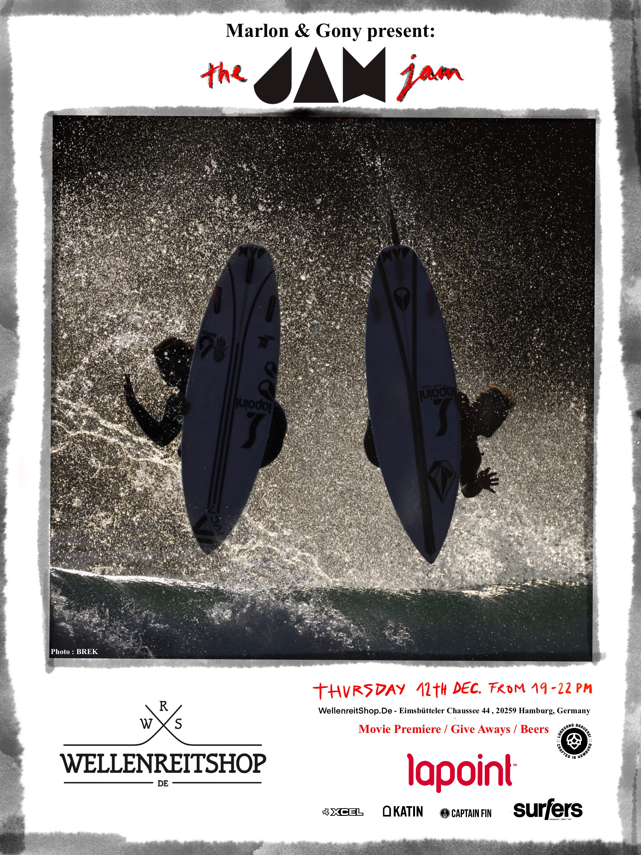 Marlon Lipke & Gony Zubizarreta kommen nach Hamburg und stellen ihren neuen Jam Traction Film im Wellenreitshop in Hamburg / Eimsbüttel vor. Neben dem Film wird eine riesige Tobambola veranstaltet und der / dem Hauptgewinner_in erwartet ein Surftip ins Ungewisse. Ab 19:00 Uhr geht es los und es gibt Free Drinks solange der Vorrat reicht. Für gute Musik und Laune ist gesorgt!