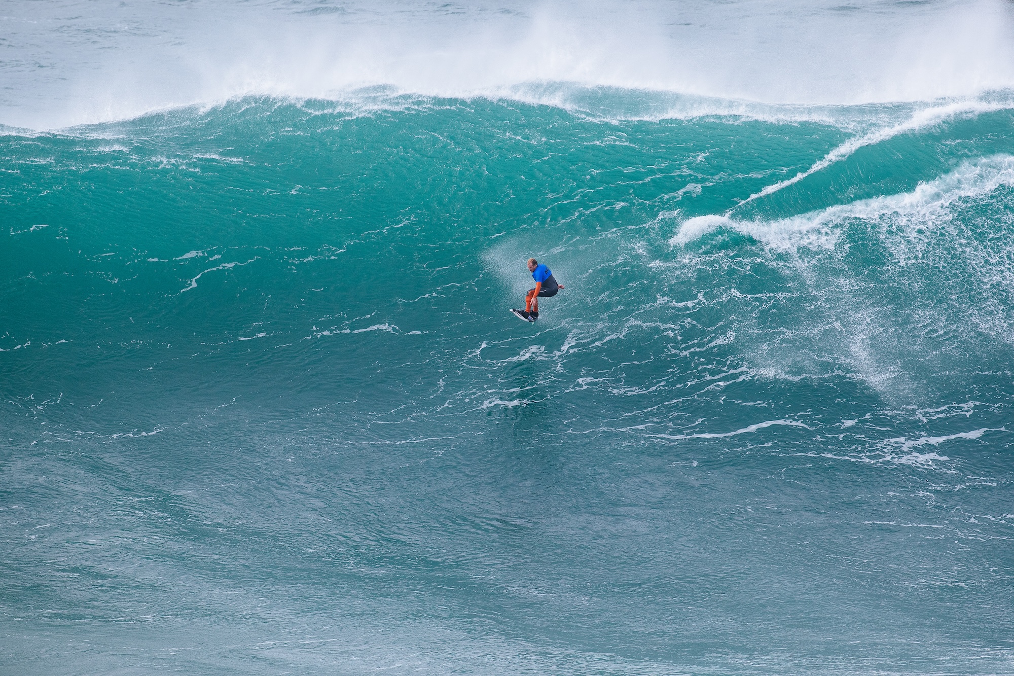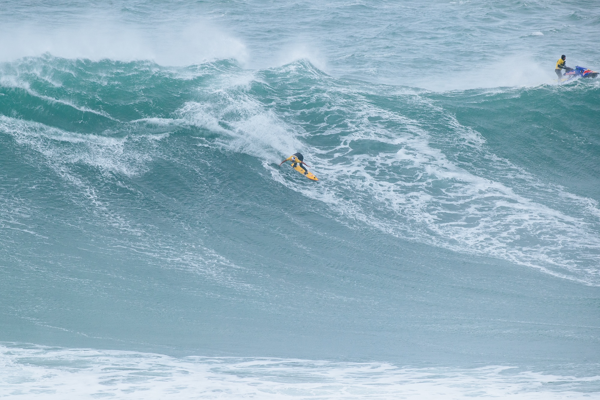 Der zweifache Titelverteidiger Lucas Chianca (BRA) musste sich diesmal mit Platz zwei zufriedengeben, während Ben Larg (SCO), der kurzfristig für Garrett McNamara (HAW) einsprang, mit starken Manövern auf den gigantischen Wellen überraschte und das Podium komplettierte.