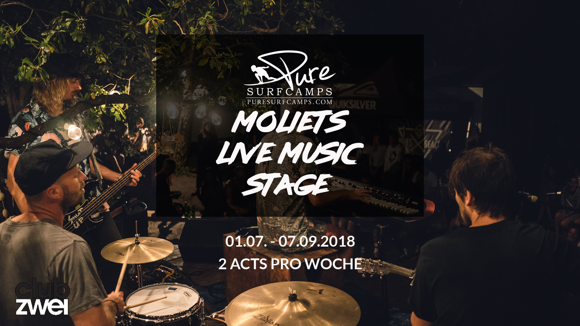 2 Live Konzerte pro Woche erwarten euch bei PURE SURFCAMP MOLIETS! Mit der Live Music Stage, auf der junge, angesagte und bekannte Bands auftreten, sind...
